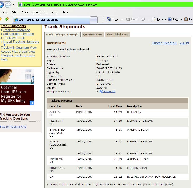 5 - 15 Business Days Example | UPS Qingdao Rep. Office No.75, Yingkou Road Shibei District Qingdao 266021 People's Republic of China Tel.: (86-532) 8383 9988 Fax: (86-532) 8390 1122 Customer Service Hotline: (86-532) 572 2388 |